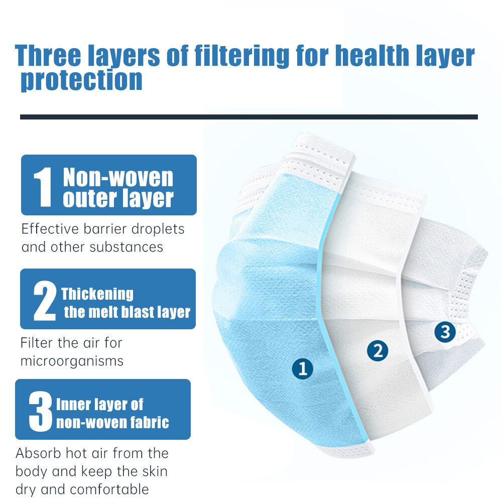 Hergestellt aus hochwertigem Vliesstoff mit einer Schmelzgeblasenen Filterschicht als Kernschicht, die effektiv Staub, Tröpfchen, Pollen und andere luftgetragene Partikel filtern kann. Die dreilagige Struktur bietet zuverlässigen Schutz und verhindert das Eindringen der meisten schädlichen Substanzen in die Atemwege; geeignet für den Einsatz an öffentlichen Orten, in überfüllten Bereichen und bei trübem Wetter.