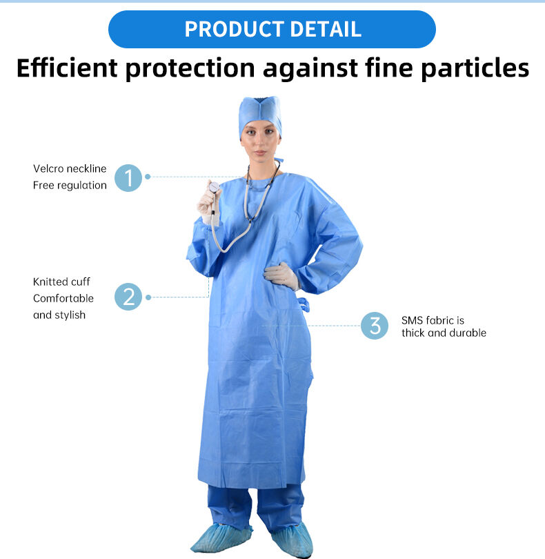 The material is PP non-woven, the materials have many good properties, such as soft,clean,good filtration and uniformity and waterproof.they are not sensitive to huamn beings, difficult to fluff,.they don't any any peculiear ssmell,other matters an primary colour.in a word.they are desirable sanitation material,they surgical gowns by using the materials have properties such as: