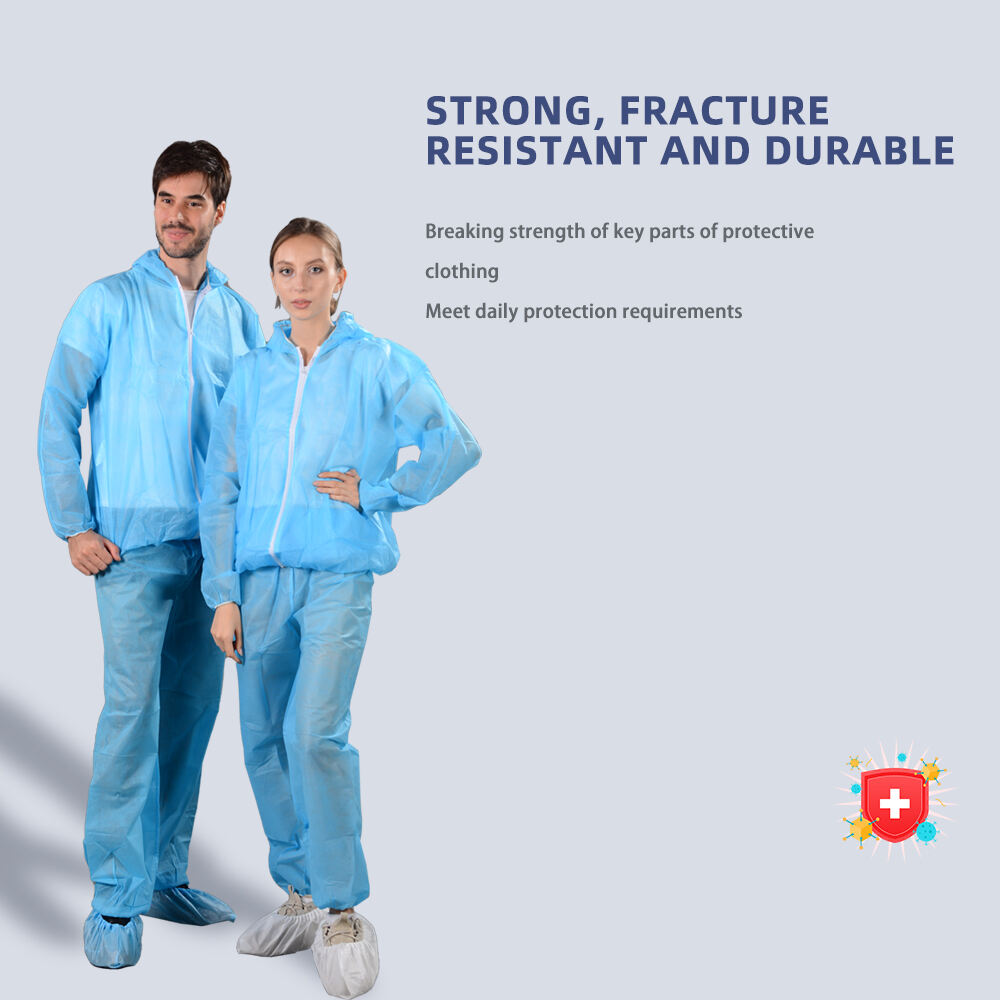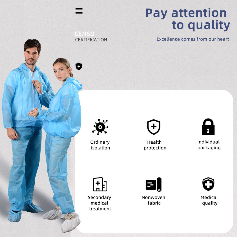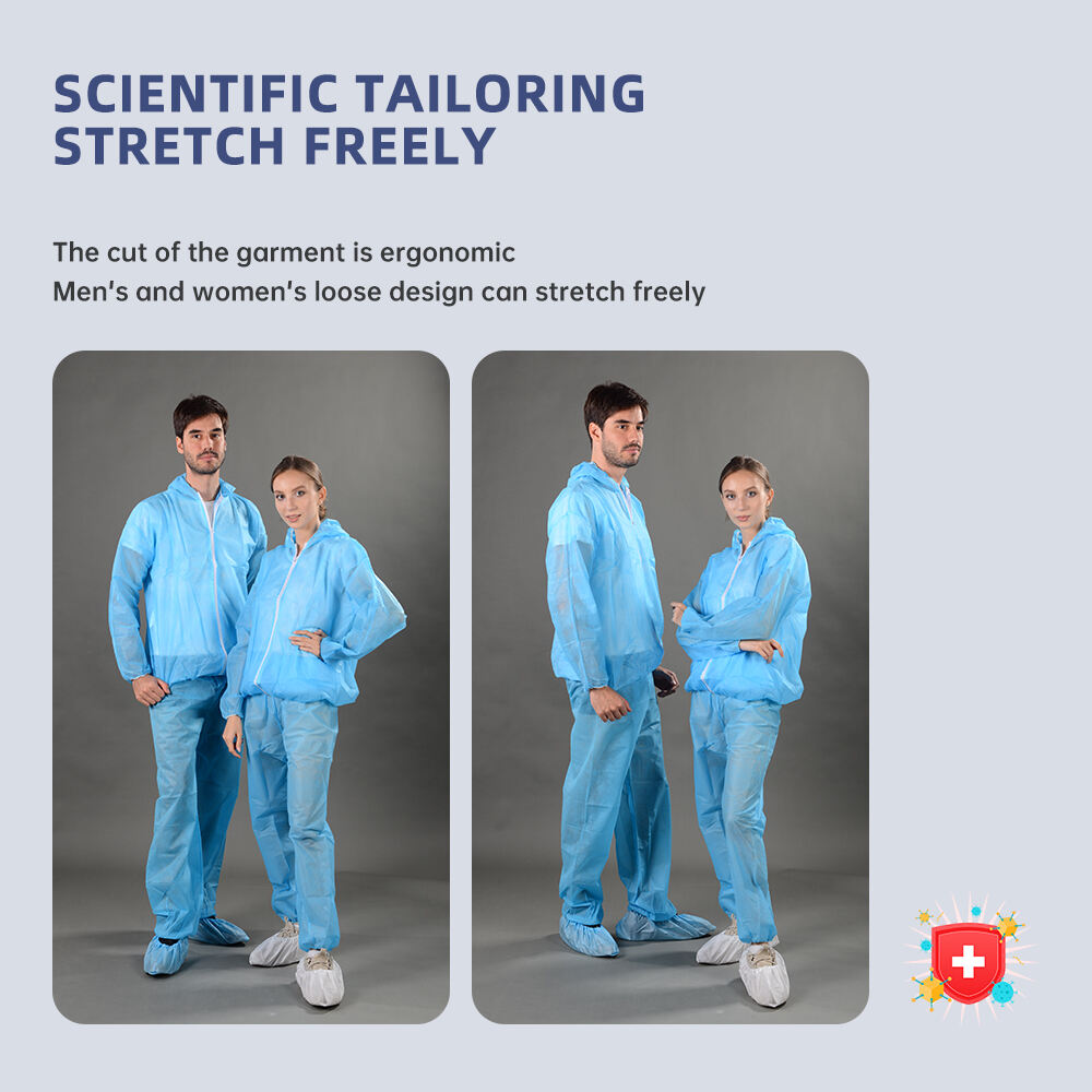 Ponadto, materiał i projekt ubrań ochronnych jednorazowych powinny spełniać wymagania noszenia związane z dużą wytrzymałością, wysoką odpornością na zużycie, mają dobrą przepuszczalność powietrza i funkcję oporu przed przenikaniem, aby zapewnić komfort i skuteczność. Materiały mogą obejmować tkaninę spunczową z polipropylenu, złożoną tkaninę spunczową z włókna poliestrowego i drzewnego, złożoną tkaninę z oddechowego filmu z polietylenu/nienapilowaną, itp. Te materiały mają dobrą funkcję barierową dla cieczy, przepuszczalność i komfort, spełniając wymagania dotyczące właściwości antystatycznych, efektywności filtracji i innych standardów, aby zapewnić bezpieczeństwo użytkowania.